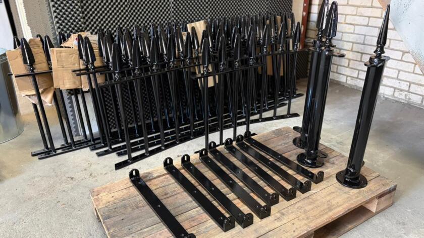 A full batch of fabricated steel railings & posts recently completed at JP Spraying in a high-gloss black protective finish.